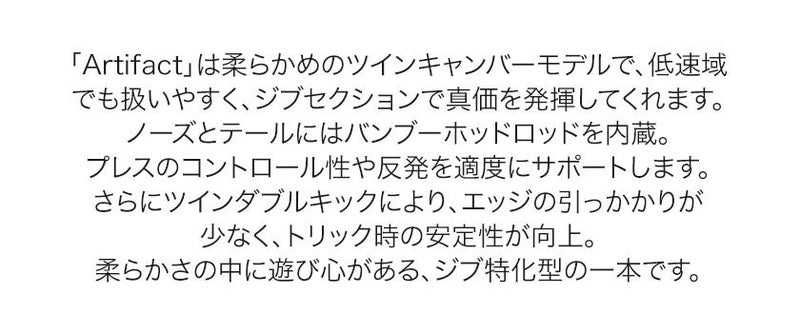 「Artifact」は柔らかめのツインキャンバーモデルで、低速域でも扱いやすく、ジブセクションで真価を発揮してくれます。