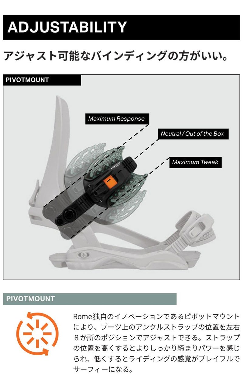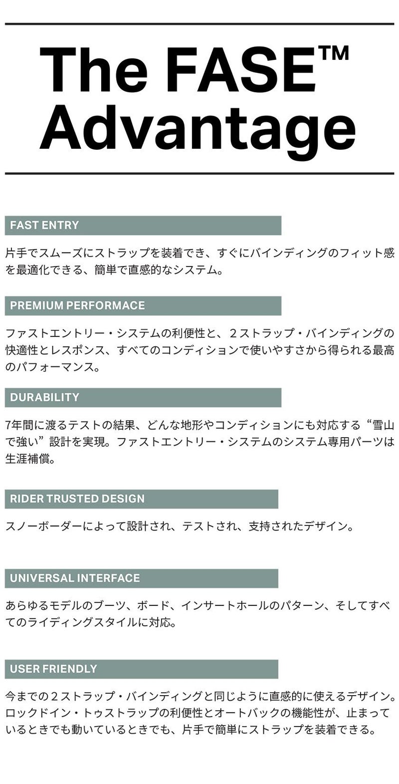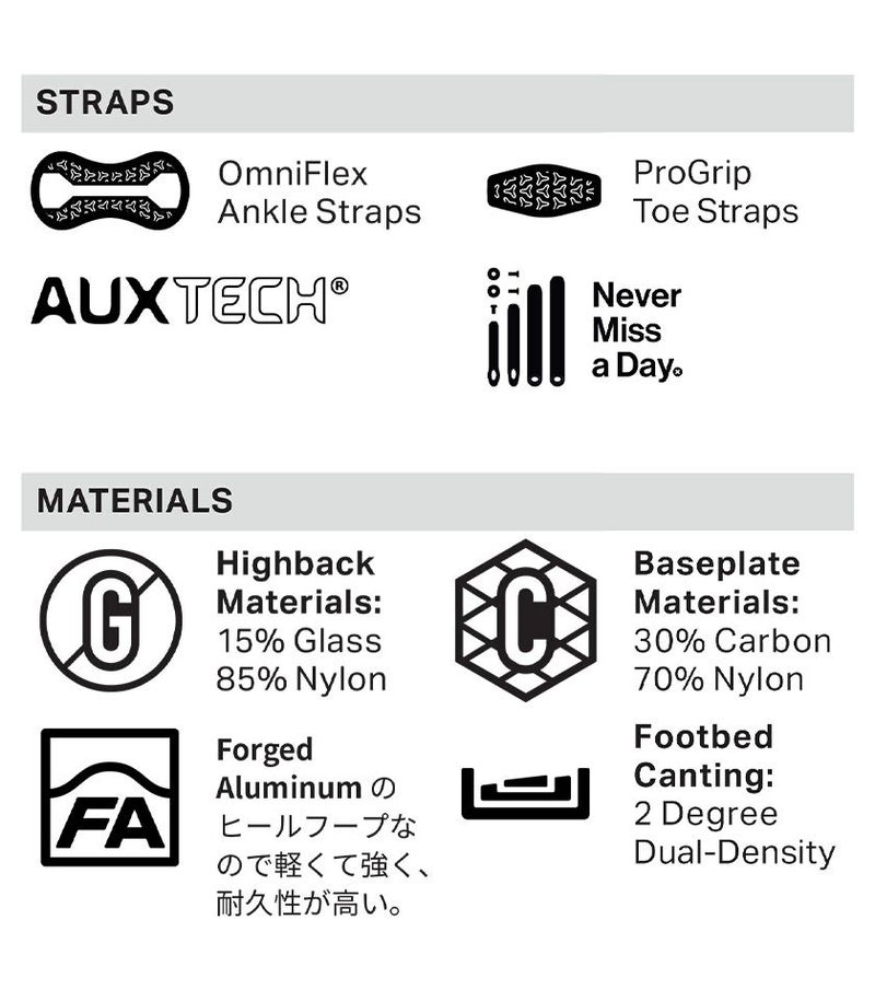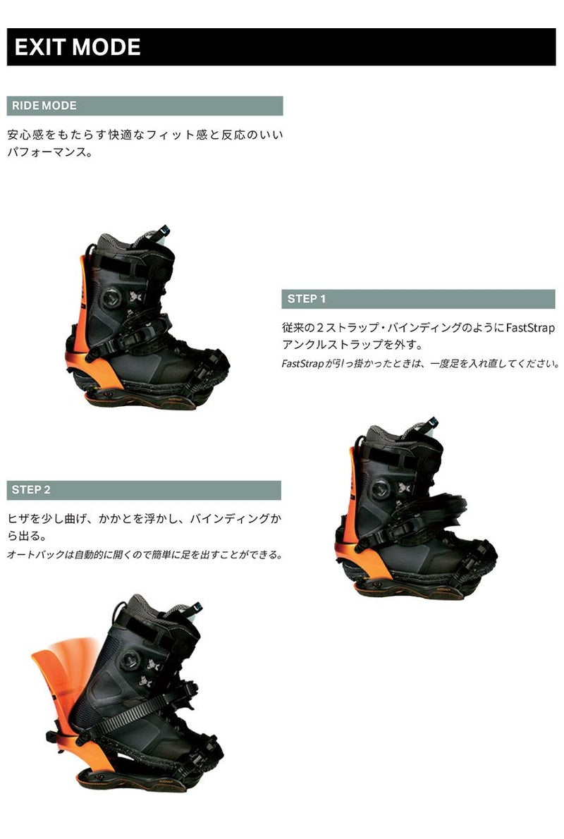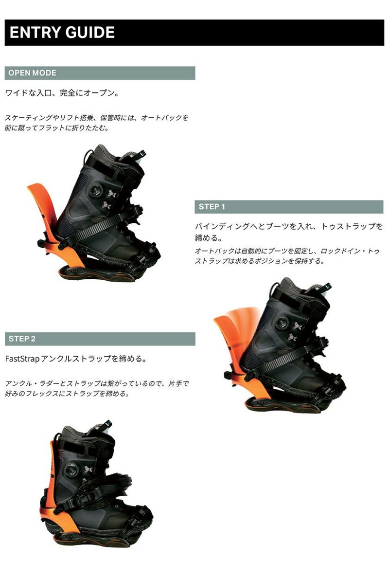 高いパフォーマンスとスーパー・アジャスタブルなKatana AWプラットフォームをベースに、FASE ファストエントリー・システムが搭載されることで、Katana の伝説的なパフォーマンスと軽量構造を最適化し、ストラップの着脱をこれまで以上に素早く簡単にする。