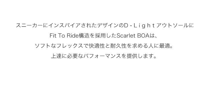 スニーカーにインスパイアされたデザインのD - L i g h t アウトソールにFit To Ride構造を採用したScarlet BOAは、ソフトなフレックスで快適性と耐久性を求める人に最適。