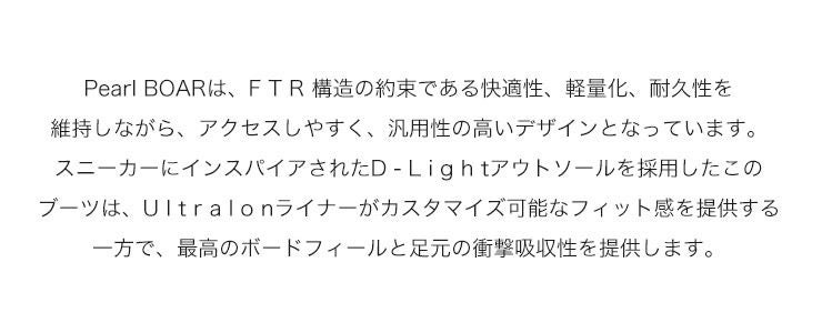 Pearl BOAは、F T R 構造の約束である快適性、軽量化、耐久性を維持しながら、アクセスしやすく、汎用性の高いデザインとなっています。