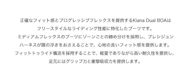 正確なフィット感とプログレッシブフレックスを提供するKiana Dual BOAはフリースタイルなライディング性能に特化したブーツです。 ミディアムフレックスのブーツにゾーンごとの締め分けを採用し、プレシジョンハーネスが踵の浮きをおさえることで、心地の良いフィット感を提供します。 フィットトゥライド構造を採用することで、軽量でありながら高い耐久性を提供し、足元にはグリップ力と衝撃吸収力を提供します