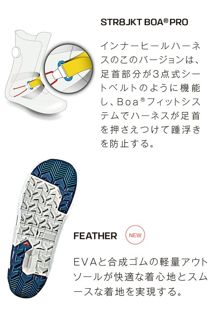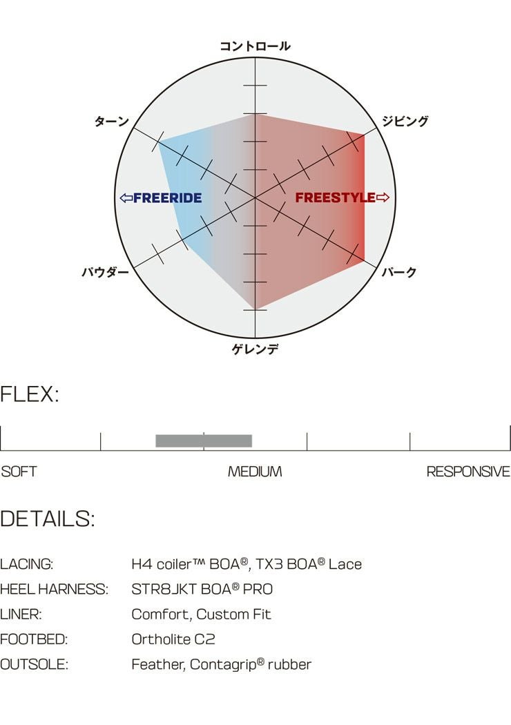 多様なライディングスタイルに適応するミディアムフレックスに最高級の素材とフィットトゥライド構造を採用し、履いた瞬間から続く快適性と、BOAを採用したSTR8JKTハーネスによるブーツと足の圧倒的な一体感を提供します。