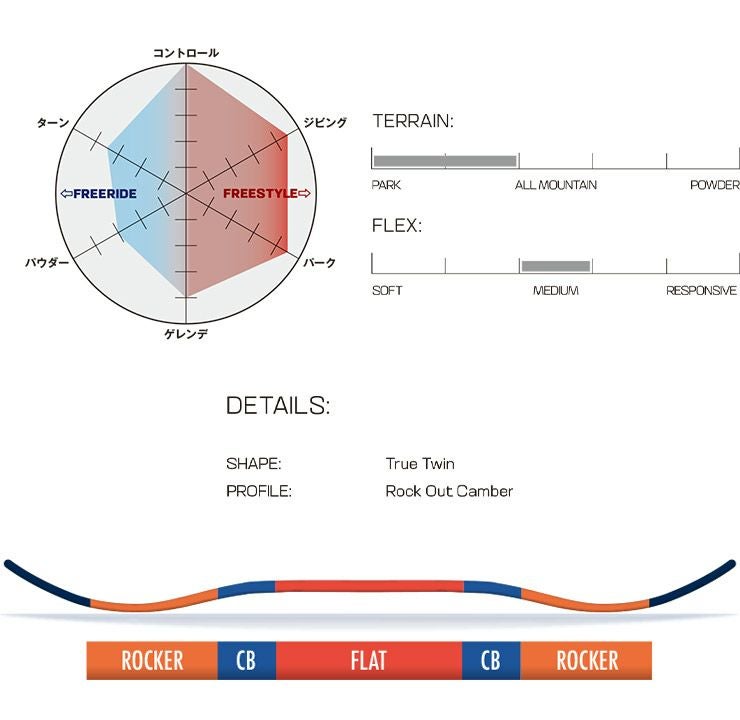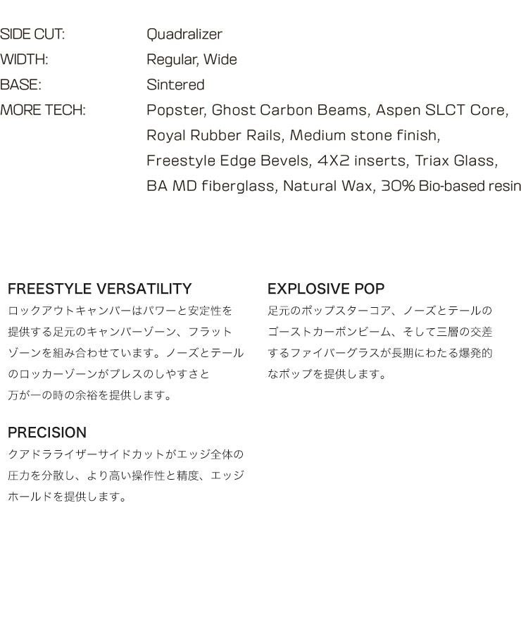このミッドフレックスのユニセックスボードには、最もポピュラーなロックアウトキャンバーとクアドラライザーサイドカットを採用し、パークやストリート、どこで乗っても万能で遊び心が満載のボードとなっております。