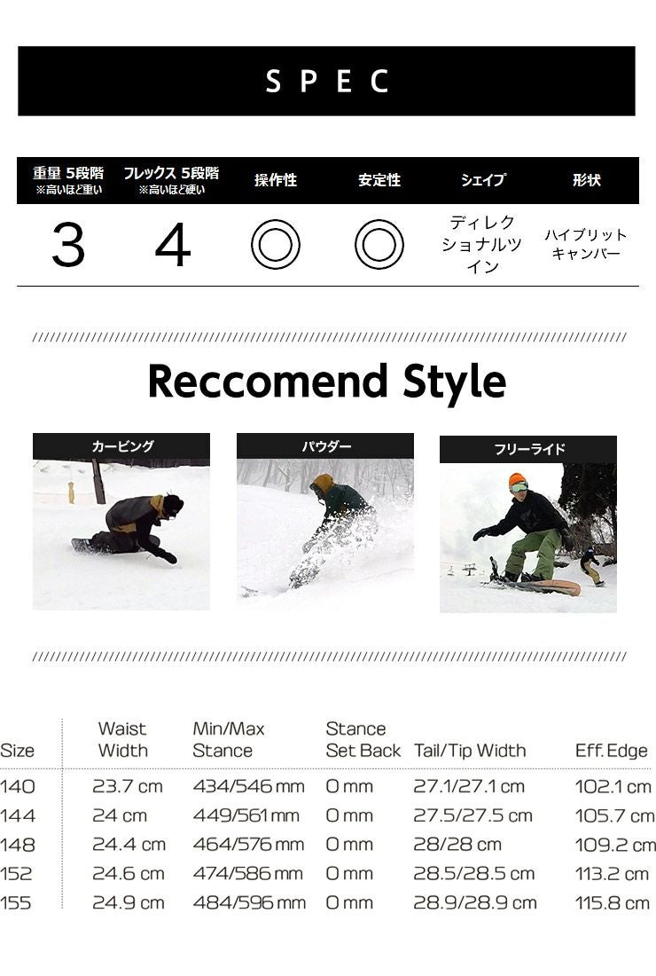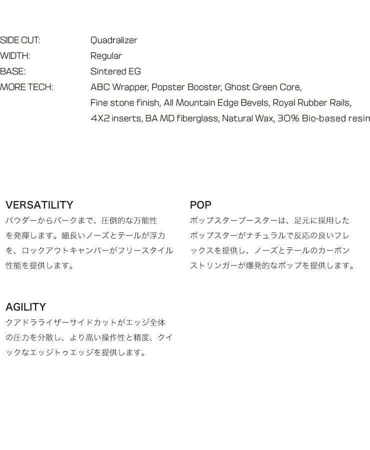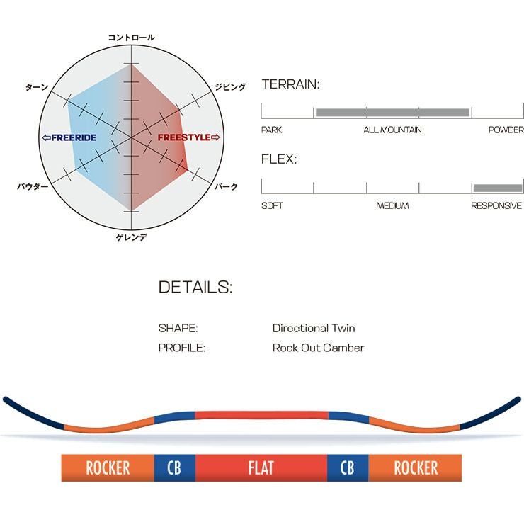 ロックアウトキャンバーがどんなコンディションでもフレースタイルな滑りを可能にし、ディレクショナルツインシェイプが深いパウダーでも高い浮力を提供します。