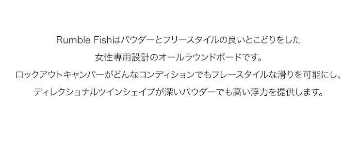 Rumble Fishはパウダーとフリースタイルの良いとこどりをした女性専用設計のオールラウンドボードです。