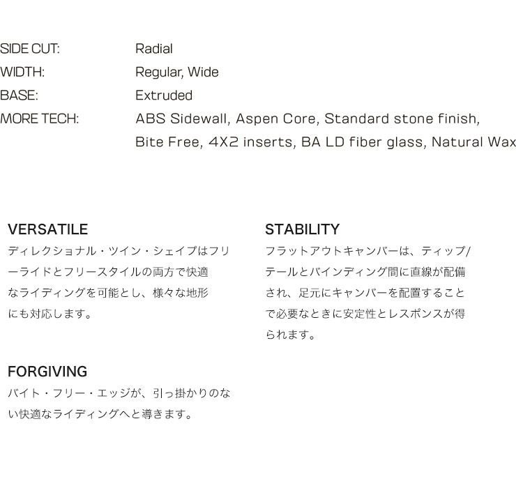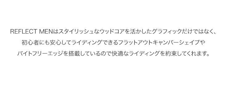 REFLECT MENはスタイリッシュなウッドコアを活かしたグラフィックだけではなく、初心者にも安心してライディングできるフラットアウトキャンバーシェイプやバイトフリーエッジを搭載しているので快適なライディングを約束してくれます。