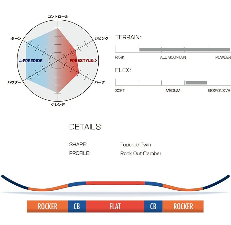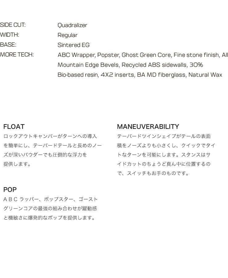年を重ねても変わることのないフリースタイルのDNAが、最高級の素材、反応の良いフレックス、テーパードツインシェイプと融合し、現代のフリーライドに対する欲求を高いレベルで満足させてくれます。