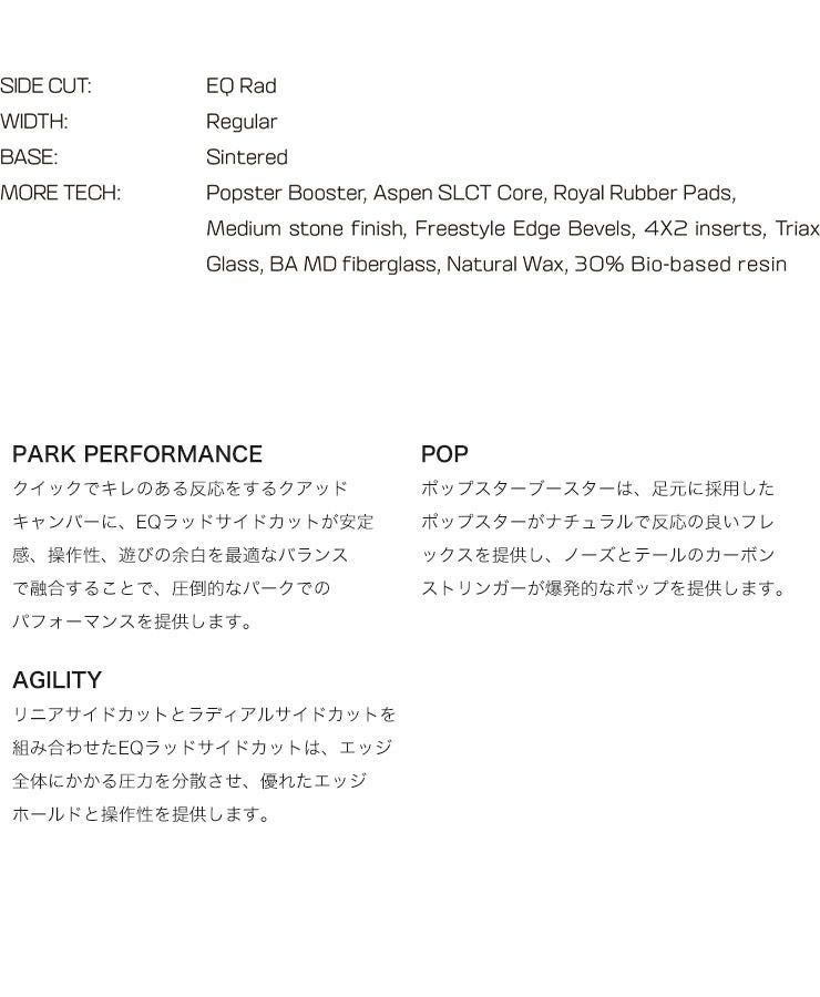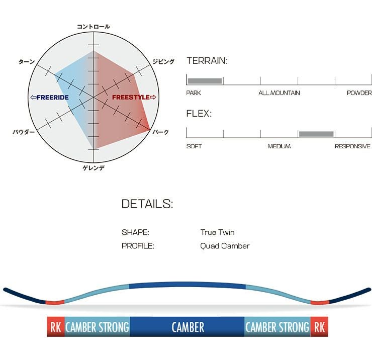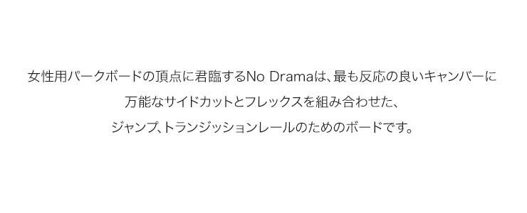 女性用パークボードの頂点に君臨するNo Dramaは、最も反応の良いキャンバーに万能なサイドカットとフレックスを組み合わせた、ジャンプ、トランジッションレールのためのボードです。