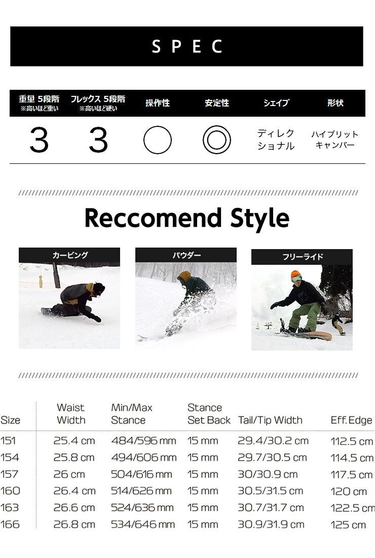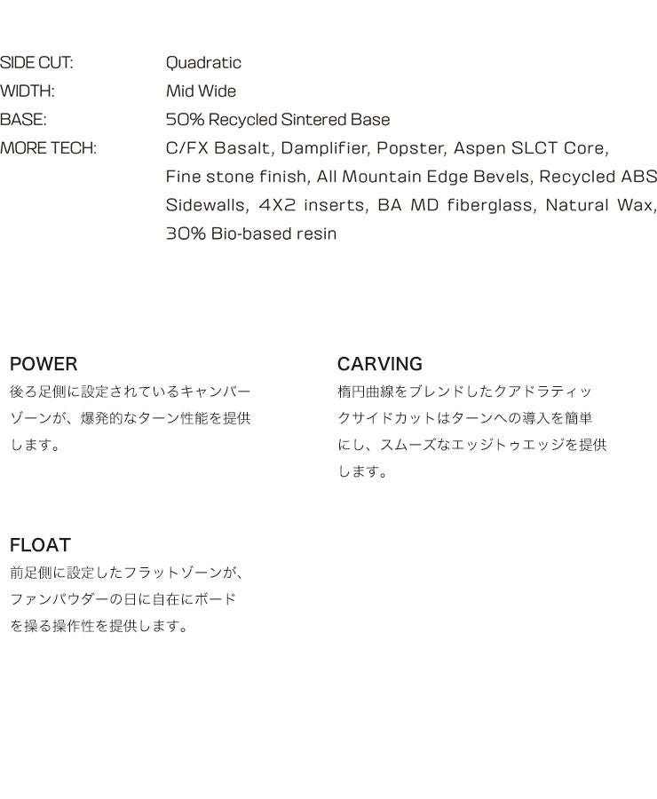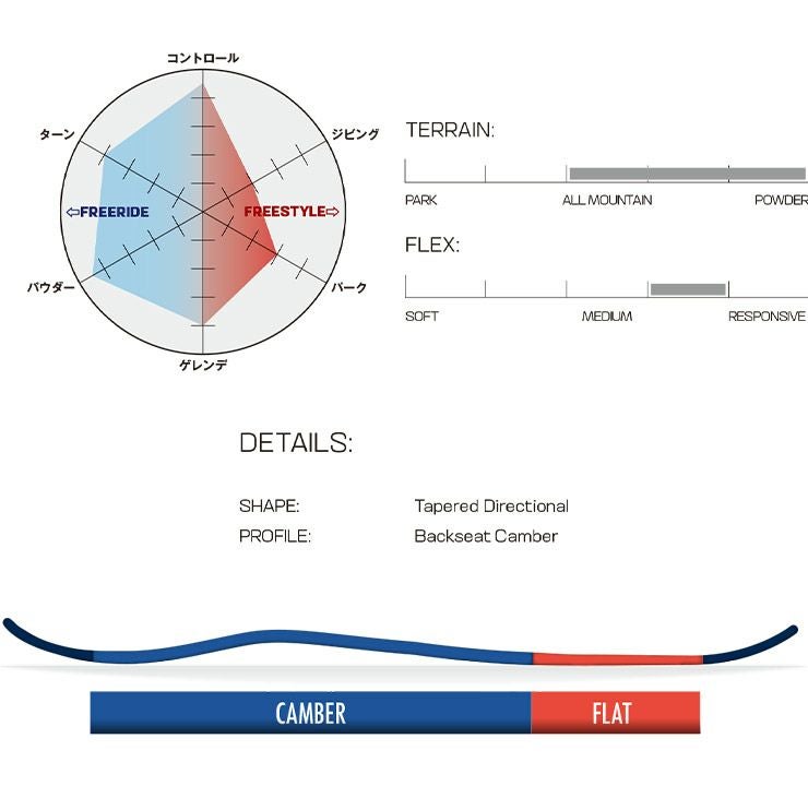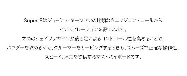 太めのシェイプデザインが後ろ足によるコントロール性を高めることで、パウダーを攻める時も、グルーマーをカービングするときも、スムーズで正確な操作性、スピード、浮力を提供するマストバイボードです。