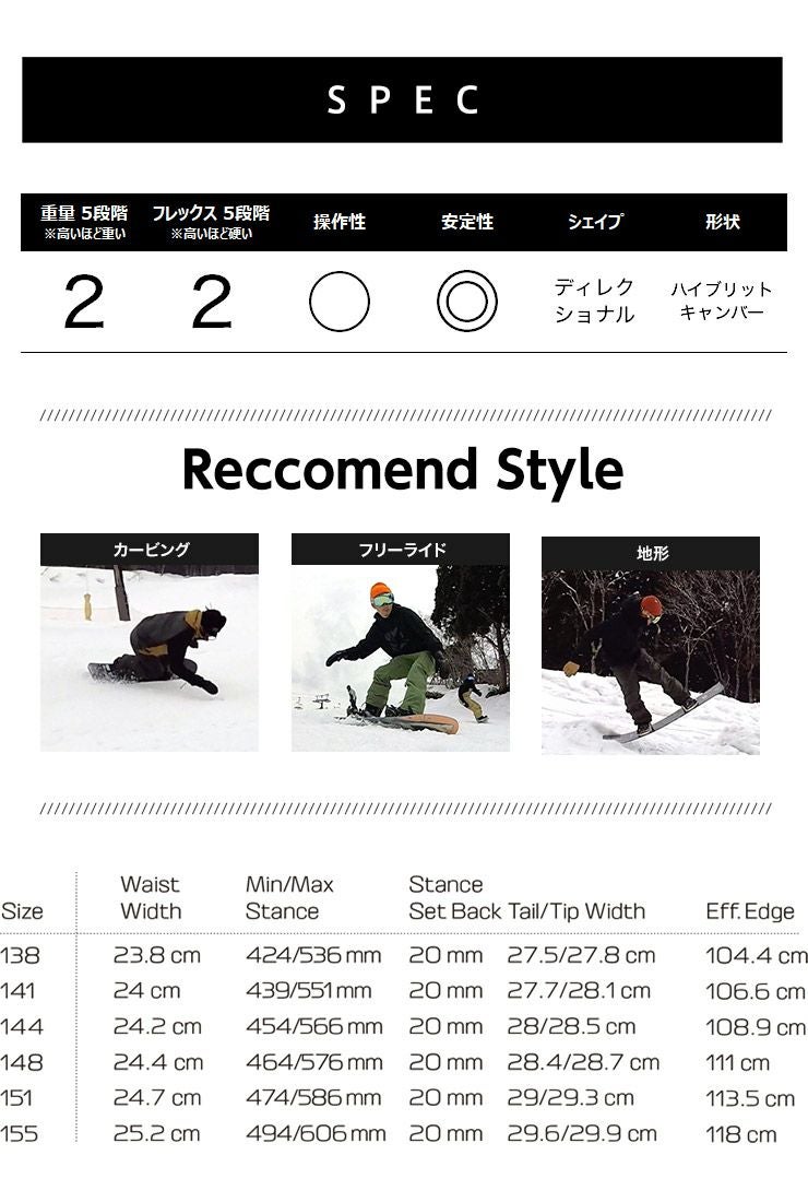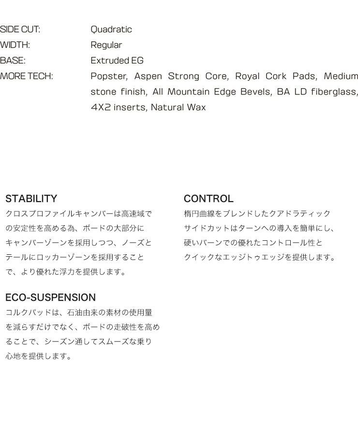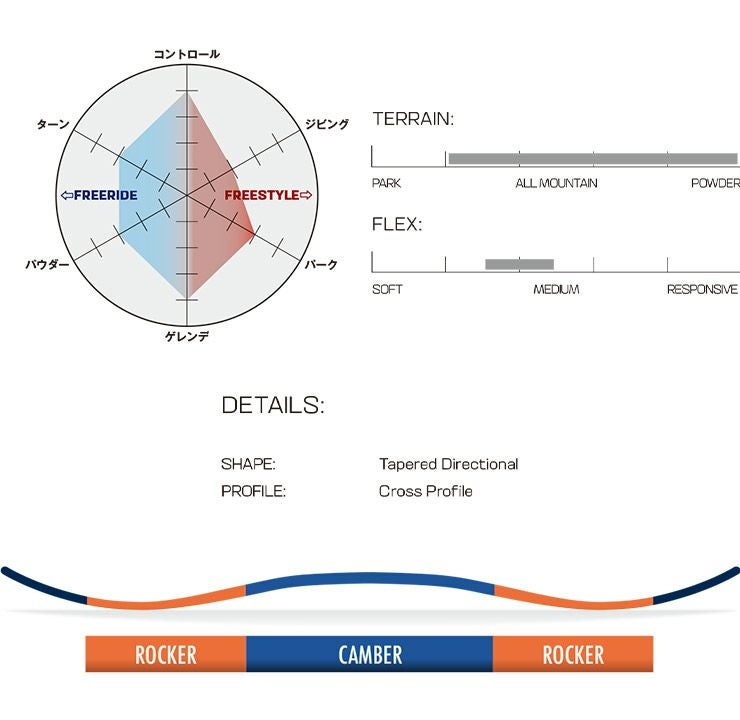 テーパードディレクショナルシェイプがターンの感動と浮力を、クロスプロファイルキャンバーがグルーマーでの安定性を提供します。