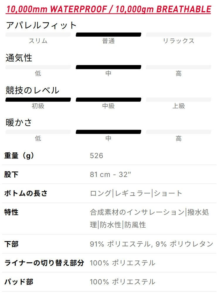 10k/10k ファブリックが風や雨に対応し、インサレーション(60g)が寒さをシャットアウト。