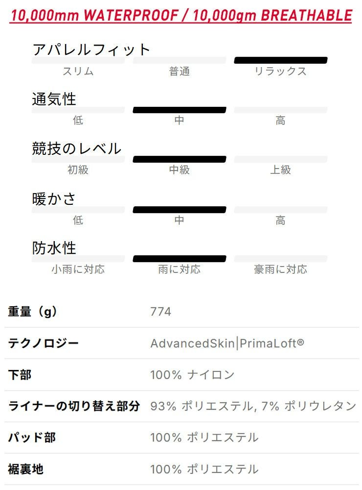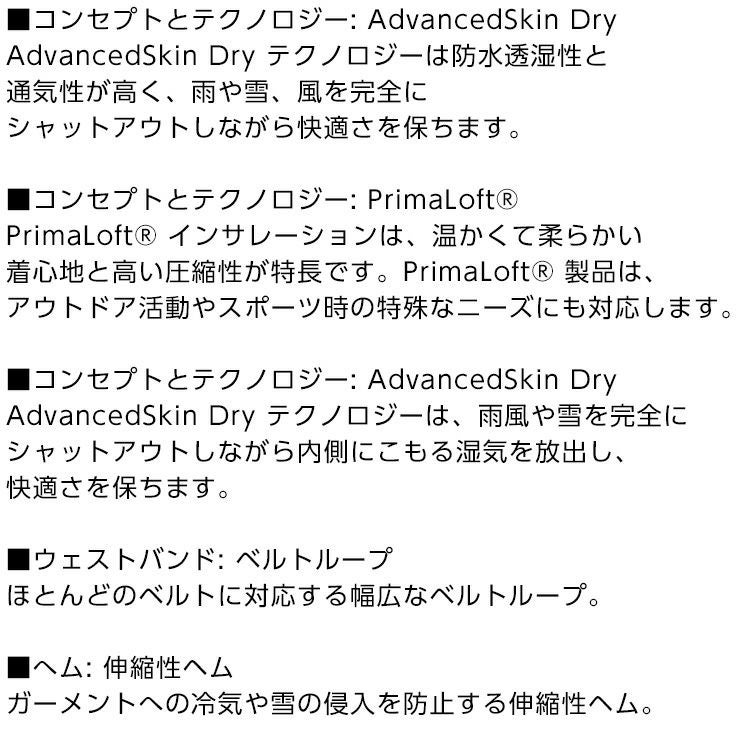 スノーゲイターを備え、伸縮性がある大きなボトムヘムはブーツの上に簡単にフィット。