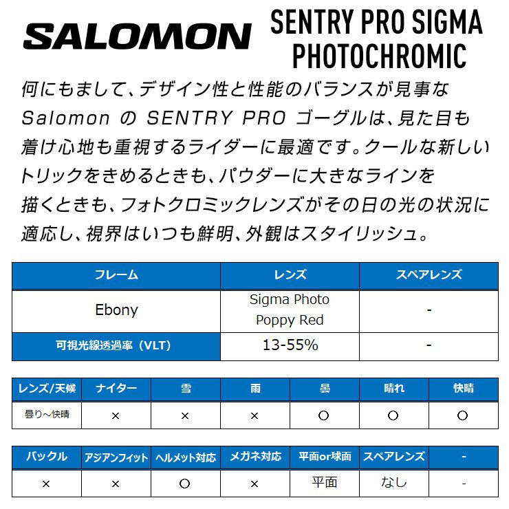 正規品 2025 SALOMON サロモン SENTRY PRO SIGMA PHOTO Ebony レンズ : Sigma Photo Poppy Red スキー スノーボード ゴーグル