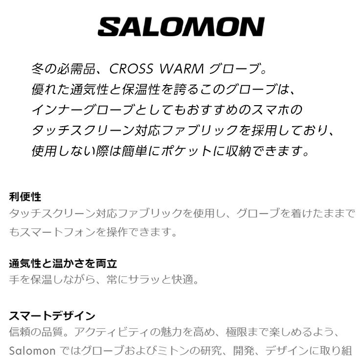 他の画像を見る 正規品 2025 スノボーグローブ 24-25 SALOMON サロモン CROSS WARM GLOVE U スノーボード インナー グローブ スノボグローブ スマホ対応 防寒 通常販売価格 ¥ 4,400 のところ WEB価格 ¥ 3,080 税込 会員特別価格 ¥ 2,926 税込 在庫切れ カートに入れる お気に入りに登録する
