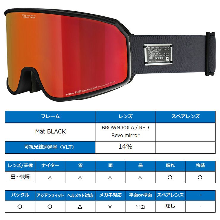 他の画像を見る 正規品 アジアンフィット SPOON スプーン EDGE type.P スノーボード ゴーグル ブーン Mat BLACK レンズ:SMOKE POLA / PPL.RED Revo mirror スキー【acc-cp-09】 通常販売価格 ¥ 13,200 のところ WEB価格 ¥ 10,989 税込 会員特別価格 ¥ 10,439 税込 カートに入れる お気に入りに登録する