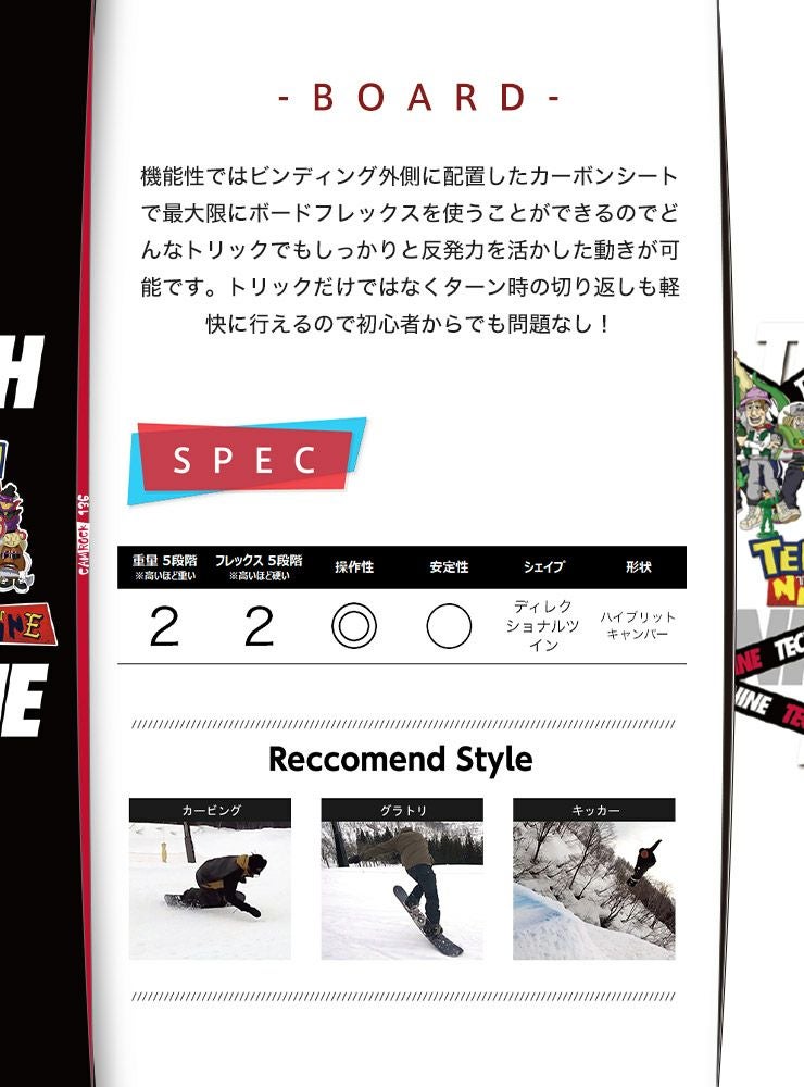 機能性ではビンディング外側に配置したカーボンシートで最大限にボードフレックスを使うことができるのでどんなトリックでもしっかりと反発力を活かした動きが可能です。
