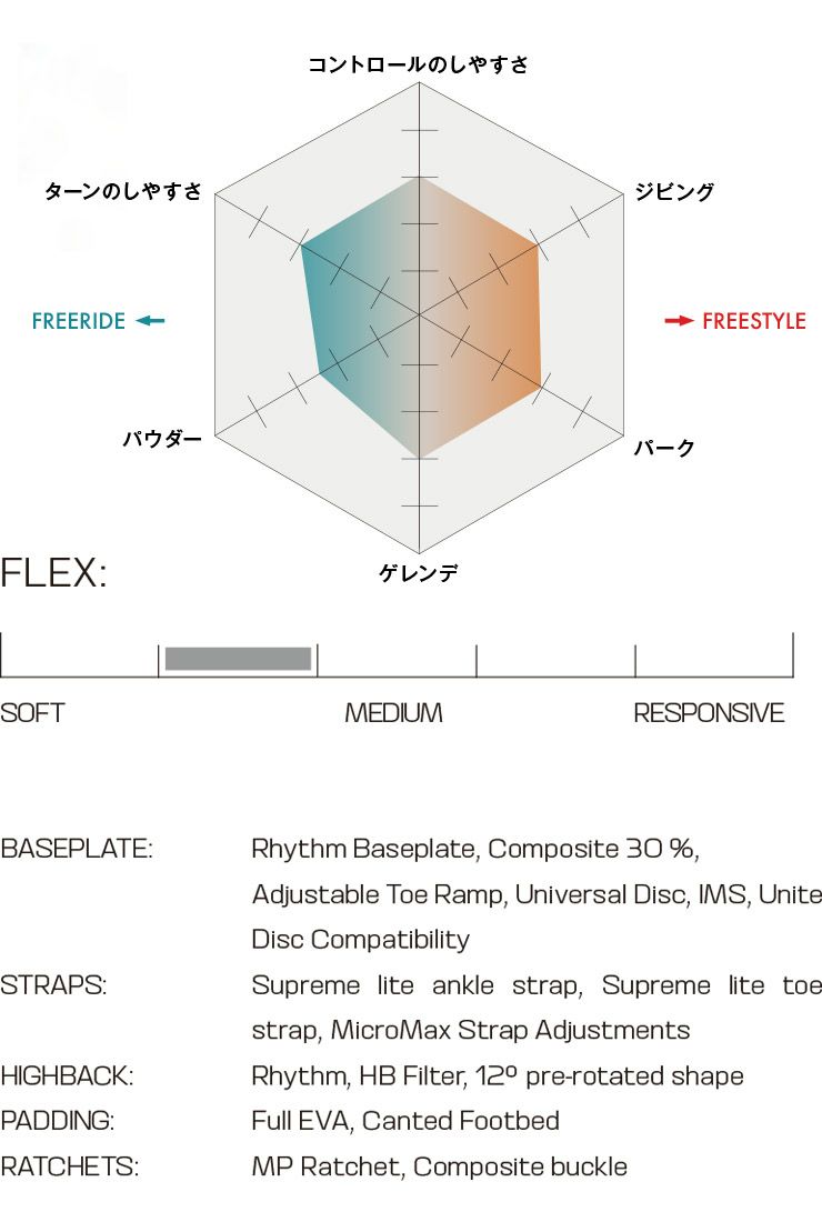機能性ではビンディング外側に配置したカーボンシートで最大限にボードフレックスを使うことができるのでどんなトリックでもしっかりと反発力を活かした動きが可能です。