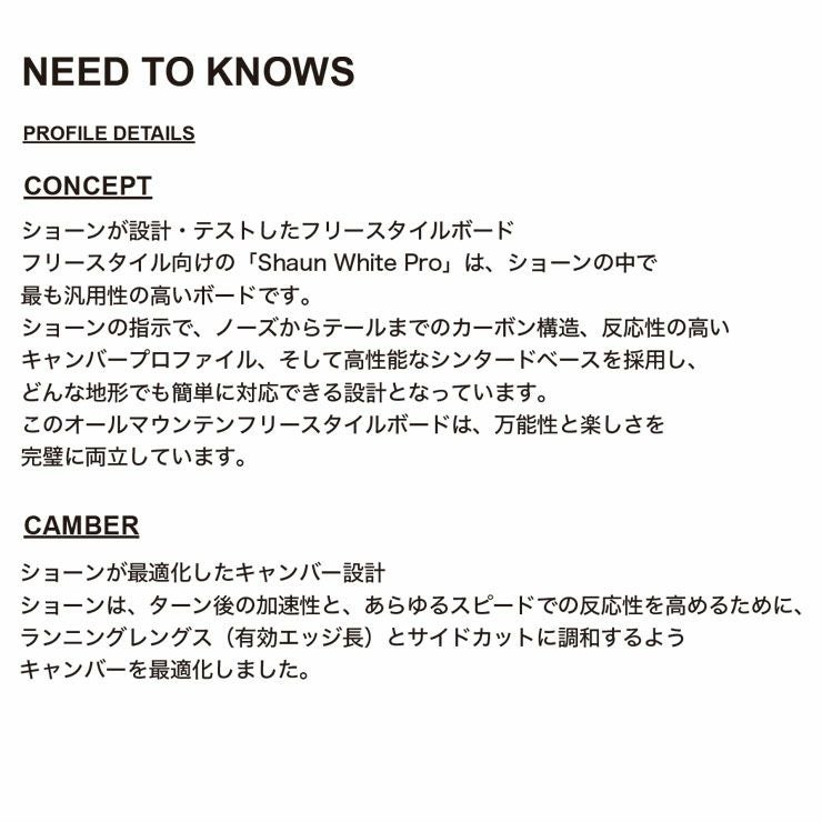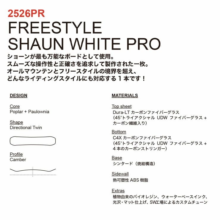 「FREESYLE SHAUN WHITE PRO」は大人向けだけのボードではない!!同じ素材、構造を備えたジュニア世代が使用できるサイズをラインナップしています。130cm、136cmはまさにジュニア向けサイズ。今や日本のジュニア&ユース世代のトップシーンでは、世界の頂点で競い合えるレベルの選手が続々と頭角をあらわしてきているが、まさにそんなキッズライダーにドンピシャのハイスペックボードだ。これまでのジュニア向けボードだと反発力が足りないと思っていた子供たちには、待望のハイパフォーマンスを備えたボード。さらに自分の可能性を大きく広げるきっかけをつくってくれるボードとなるはず。