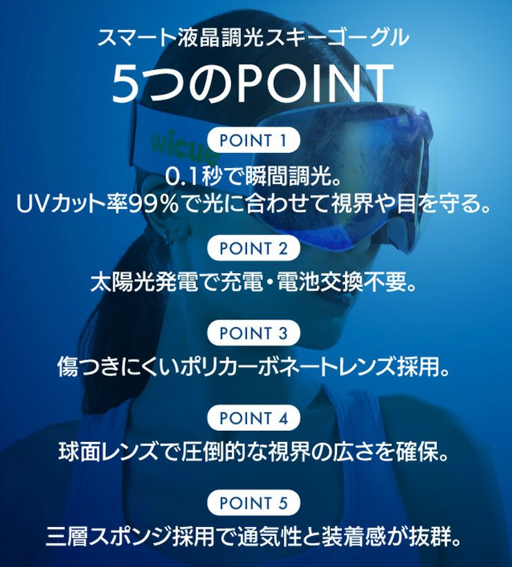 1. インテリジェンス光センサーでゴーグルのレンズの濃度を0.1秒で自動調整。太陽光電池で充電不用。