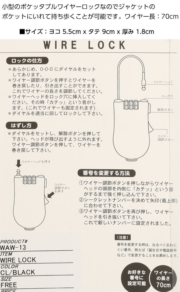 スノーボード ワイヤーロック WAW ワウ WIRE LOCK ケーブルロック 巻き取り式 盗難防止 板 ワイヤー 鍵 スノボ 【acc-cp-09】