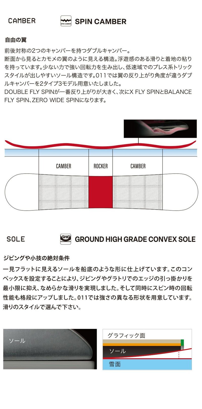 カモメの翼のようなダブルキャンバーソール形状は低速でのスピン、ドライブ(ずらし)が容易です。