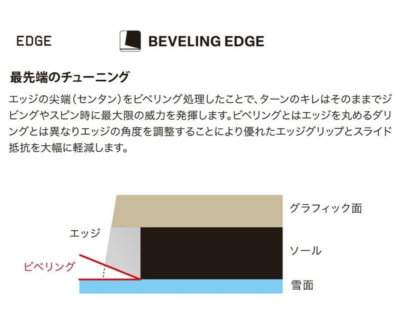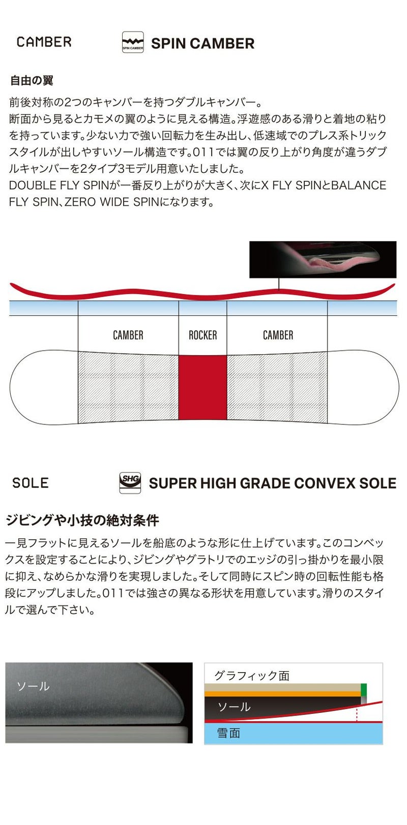 また、コンベックス形状は011の中では最も強く設定され、雪面への抵抗が極めて少ないソール形状で縦にも横にも軽い操作性は圧巻です。