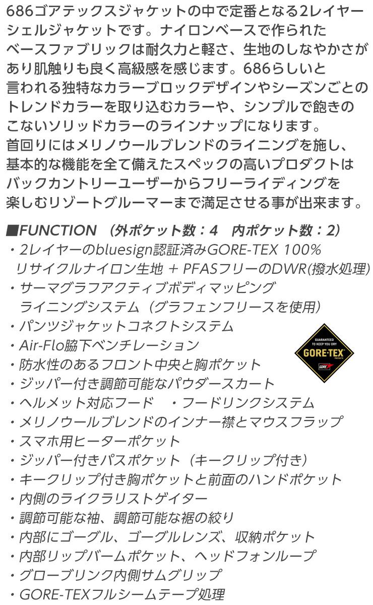 686ゴアテックスジャケットの中で定番となる2レイヤーシェルジャケットです。