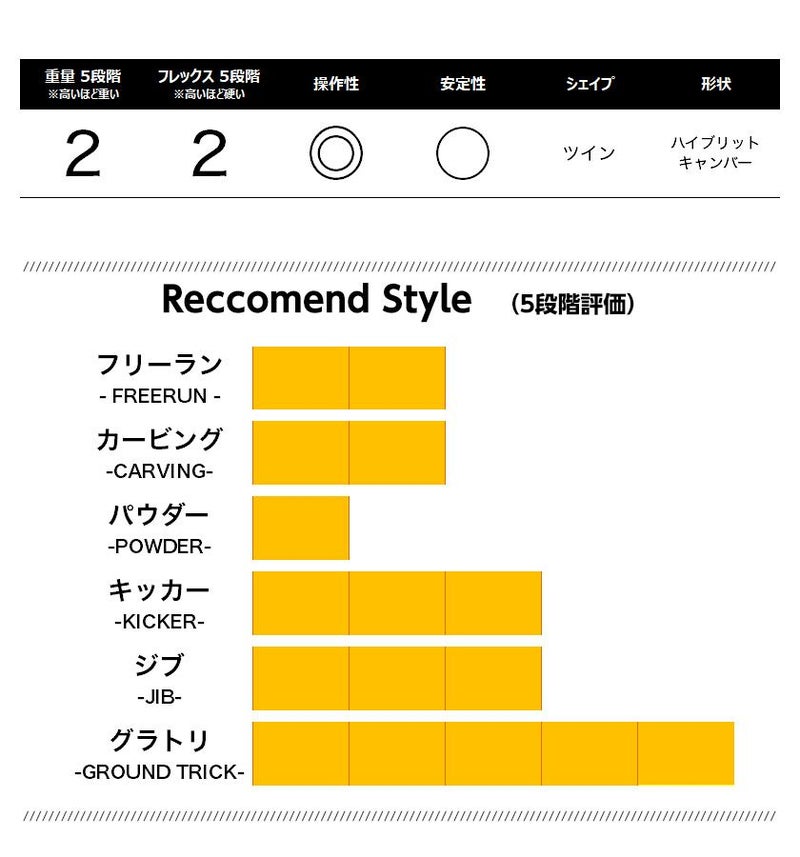 脚力の少ない女性でもプレス、ズラし、弾くというグラトリの動きをより簡単に楽しむことができるように開発。 有効面積の広いノーズ、テールは安定性が高く、体重を預けることができ、スムーズにトリックに入れる。
