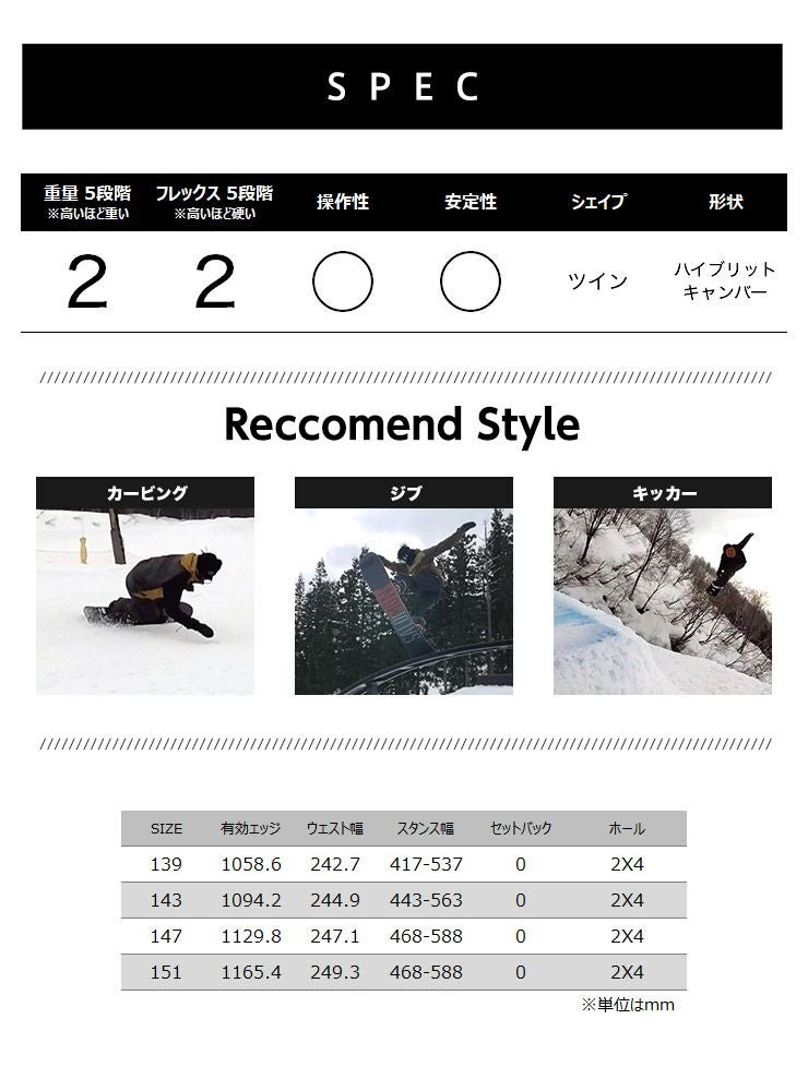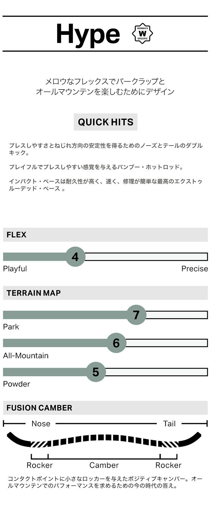 HYPEは、柔らかなフレックスでパークラップとオールマウンテンを楽しむためにデザインされたウィメンズボードです。プレスしやすさとねじれ方向の安定性を得るためのノーズとテールのダブルキック。プレイフルでプレスしやすい感覚を与えるバンブー・ホットロッド。インパクト・ベースは耐久性が高く、速く、修理が簡単な最高のエクストゥルーデッド・ベース。
