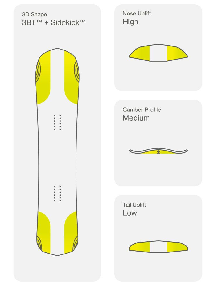 普段のボードよりも5-10cm短くして、浮遊感のある滑りを楽しんでください。