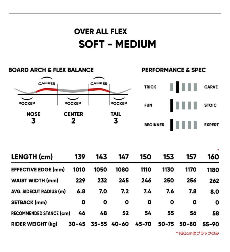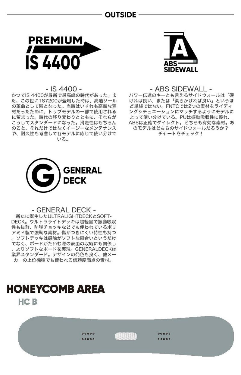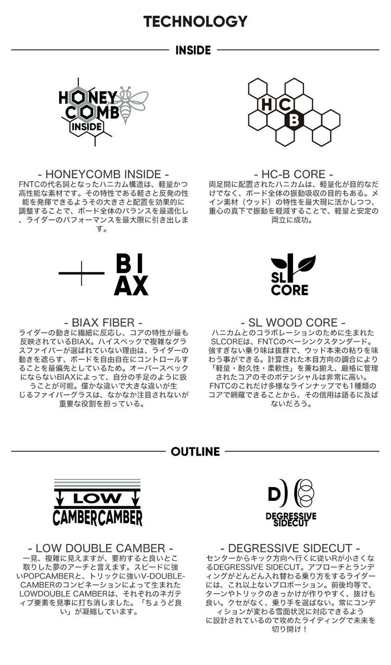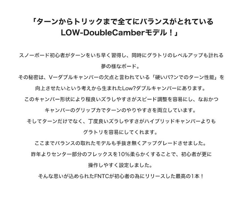 「ターンからトリックまで全てにバランスがとれているLOW-DoubleCamberモデル! 」 スノーボード初心者がターンをいち早く習得し、同時にグラトリのレベルアップも計れる夢の様なポード。 その秘密は、Vーダブルキャンバーの欠点と言われている「硬いパ?ンでのターン性能」を向上させたいという考えから生まれたLow?ダブルキャンバーにあります。 このキャンバー形状により程良いズラしやすさがスピード調整を容易にし、なおかつキャンバーのグリップカでターンのやりやすさを両立しています。 そしてターンだけでなく、丁度良いズラしやすさがハイブリッドキャンバーよりもグラトリを容易にしてくれます。 ここまでバランスの取れたモデルも手抜き無くアップグレードさせました。 昨年よりセンタ一部分のフレックスを10%柔らかくすることで、初心者が更に操作しやすく設定しました。 そんな思いが込められたFNTCが初心者の為にリリースした最高の1本!