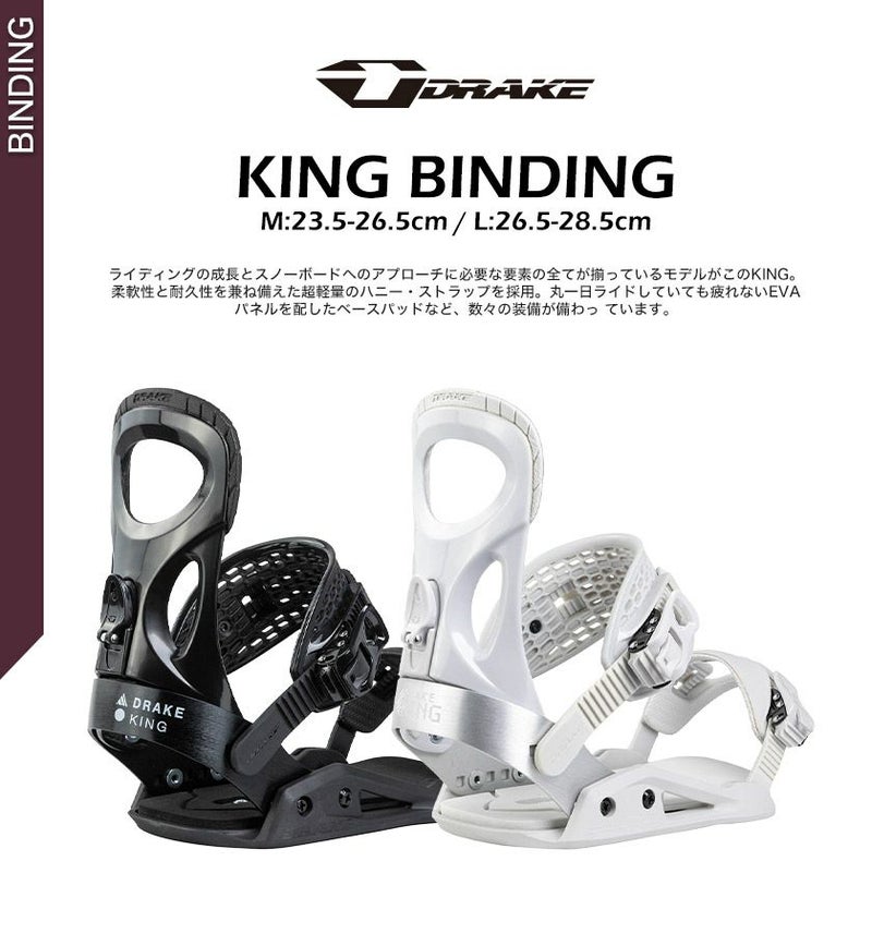 ライディングの成長とスノーボードへのアプローチに必要な要素の全てが揃っているモデルがこの KING。 柔軟性と耐久性を兼ね備えた超軽量のハニー・ストラップを採用。丸一日ライドしていても疲れないEVAパネルを配したベースパッドなど、数々の装備が備わっています。