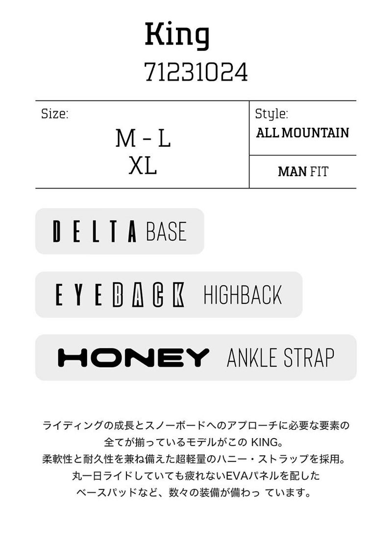 ライディングの成長とスノーボードへのアプローチに必要な要素の全てが揃っているモデルがこの KING。 柔軟性と耐久性を兼ね備えた超軽量のハニー・ストラップを採用。丸一日ライドしていても疲れないEVAパネルを配したベースパッドなど、数々の装備が備わっています。