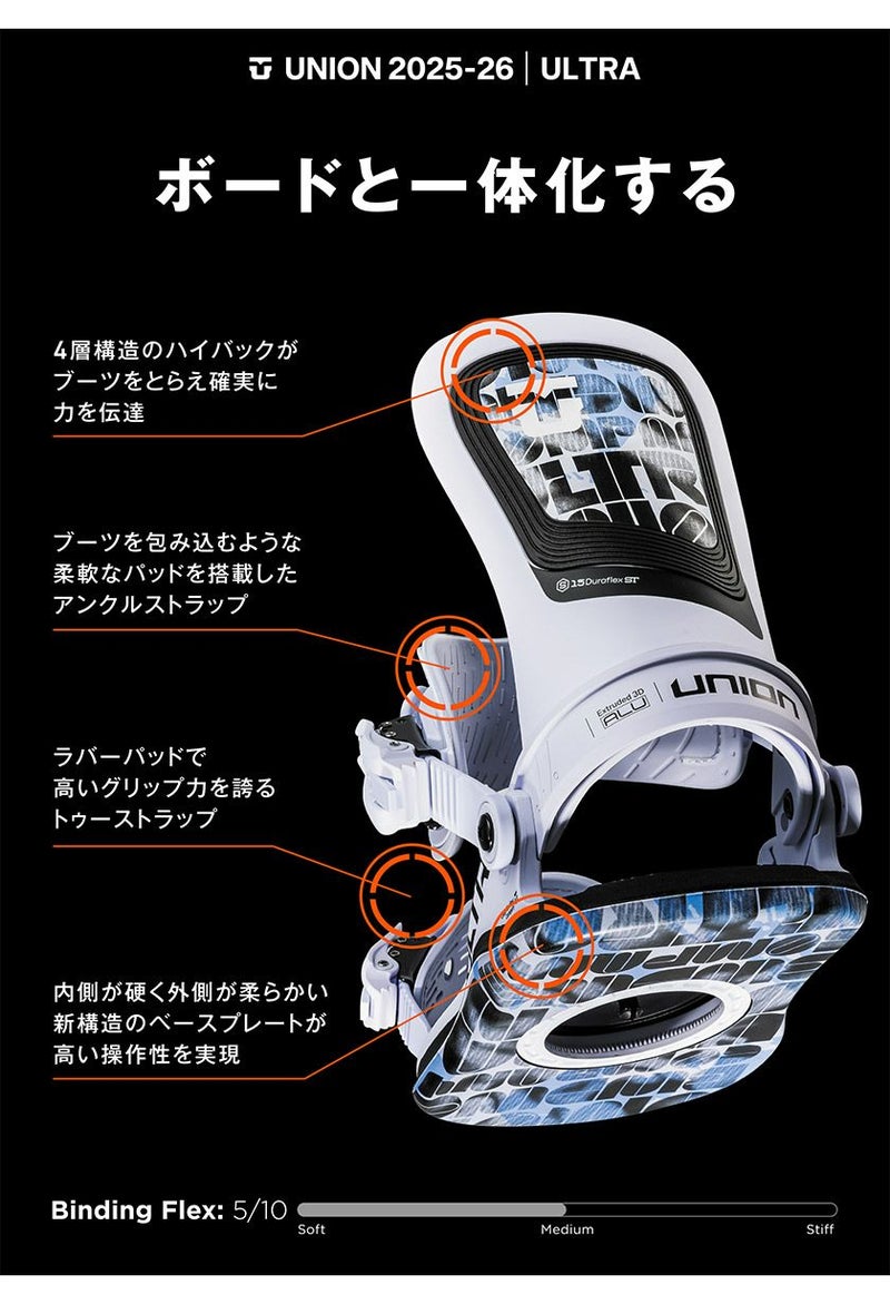 これまでに開発された中で最も快適なスノーボード・バインディング。ユニオン・ウルトラは、今まで経験したことのないような柔軟でクッション性のある乗り心地を提供する。