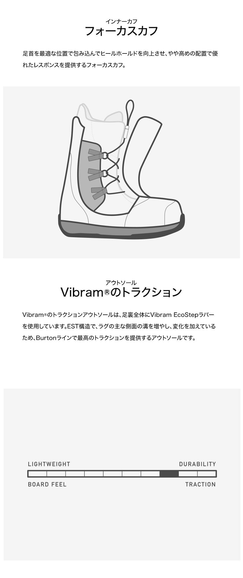 目的に合わせて前足部とブーツ上部のフィット感を個別に微調整できるデュアルゾーンBOARフィットシステムを搭載。