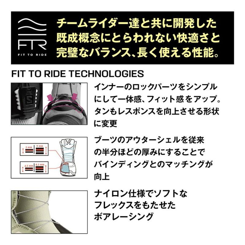 多様なライディングスタイルに適応するミディアムフレックスに、最高級の素材とフィットトゥライド構造を採用し、履いた瞬間から続く快適性と、BOAを採用したSTR8JKTハーネスによるブーツと足の圧倒的な一体感を提供します。