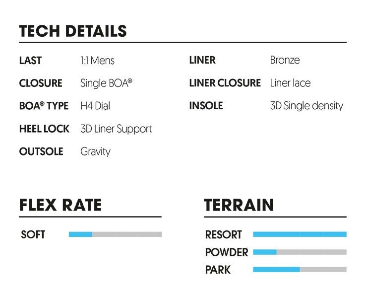 ラインアップの中で最も柔らかいRangerは初心者が扱いやすいフレックスでありながら、数多くのテックが凝縮したブーツです。