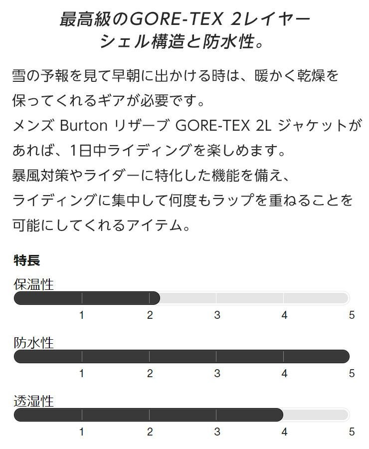 メンズ Burton リザーブ GORE-TEX 2L ジャケットがあれば、1日中ライディングを楽しめます。