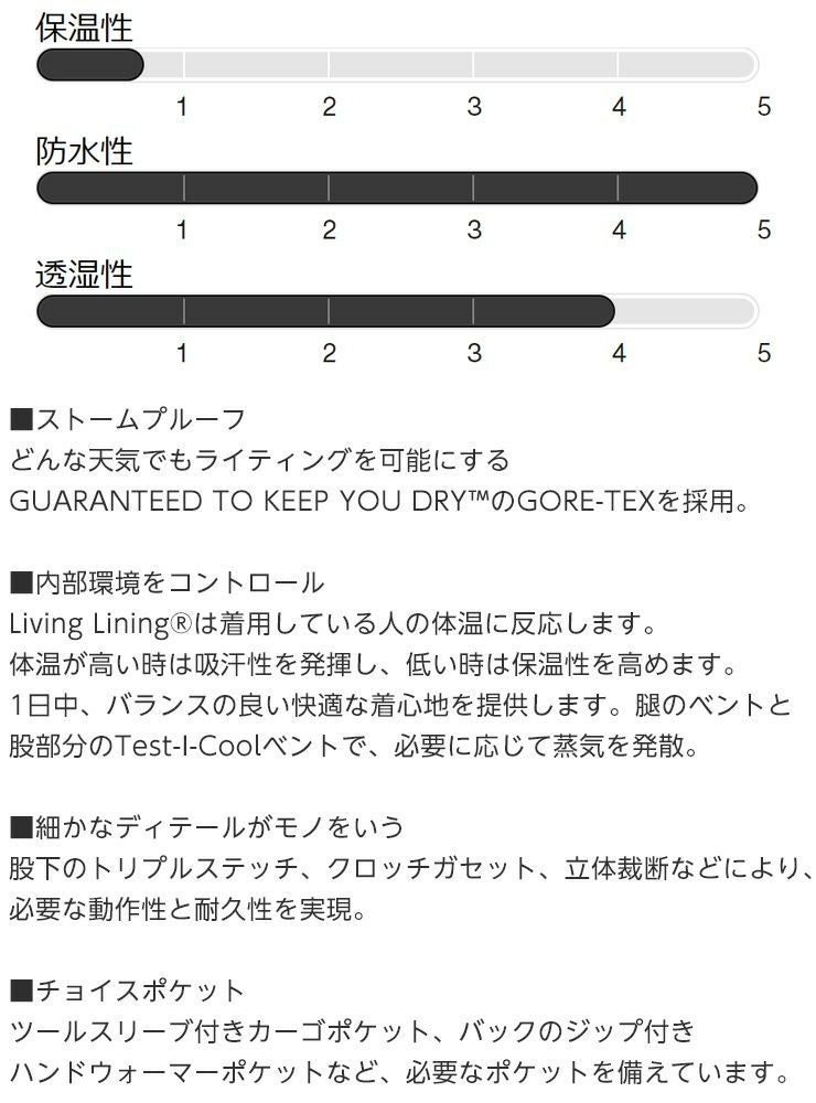 GORE-TEX 2レイヤー 70Dナイロンプレーンウーブン素材 / レギュラー立体裁断フィット / 保温性:シェル / 耐摩耗カフ / 動作性を高める立体裁断 / バンジーカフエレベーター / Crossflow Venting / 動作性を高めるクロッチガセット / トリプルニードルで強化されたインシーム / YKK耐水ジップ