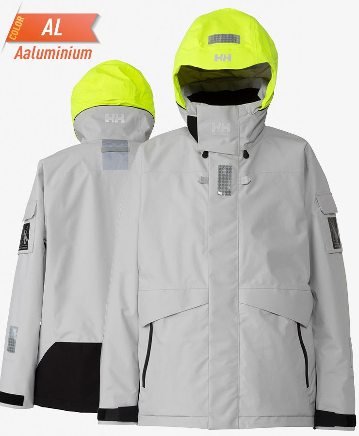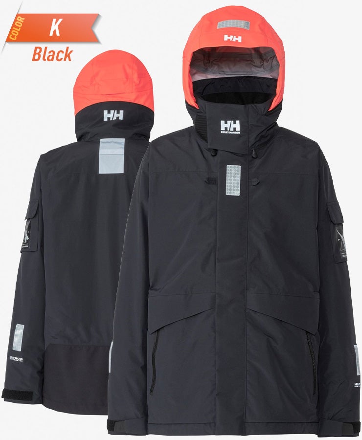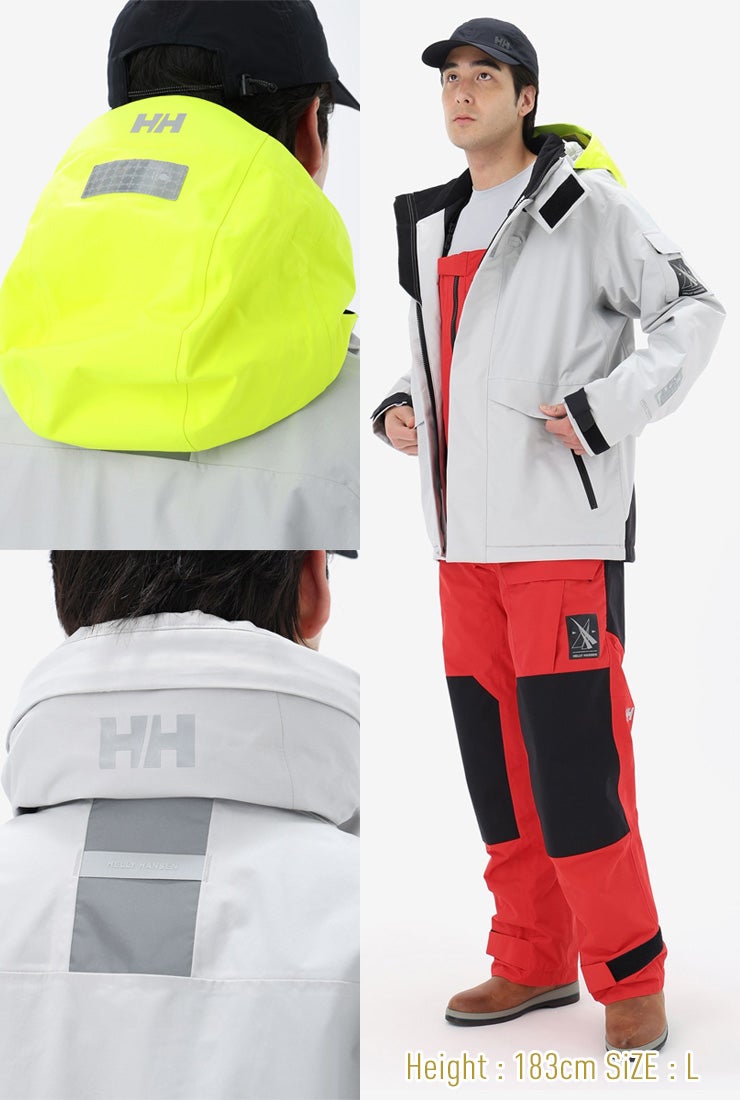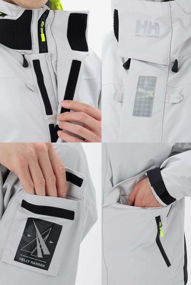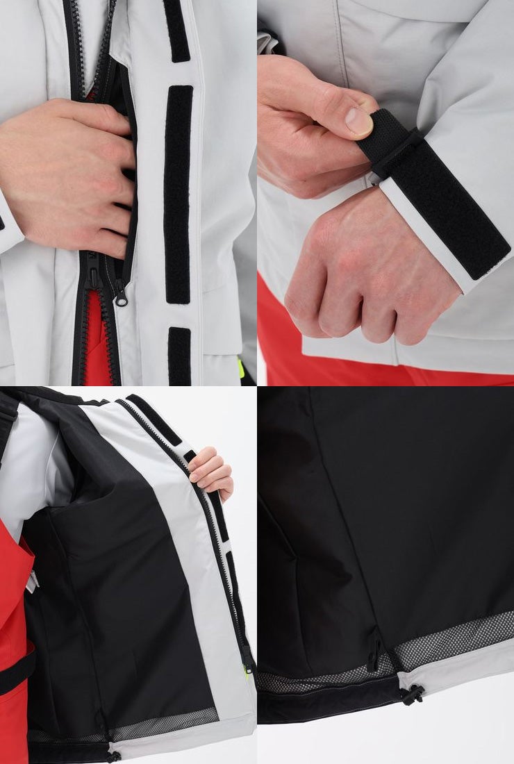 袖口はダブルカフで気密性をもたせ、水の浸入を軽減しています。 フラッシュイエローやフラッシュオレンジを配色したフードや、SOLAS条約(海上人命安全条約)に準じたリフレクトサイトのワッペンを設けることで、海上での視認性を高めています。