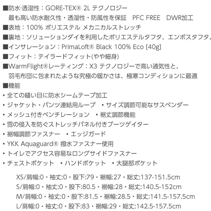 非常に防水、透湿性能に優れたGORE-TEX2L 高機能パンツ。中綿素材に保温性が高く軽い、防水テクノロジー&ダウンを超えた人口羽毛のPRIMALOFTを搭載し、軽量です。