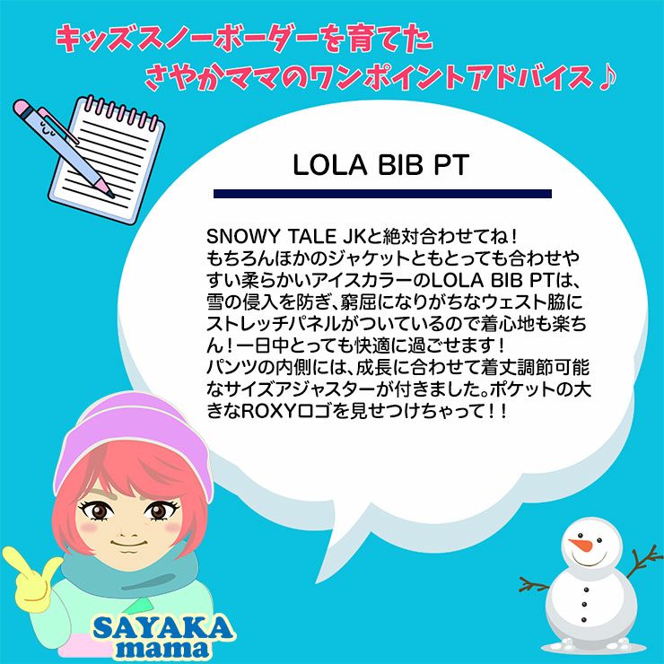 SNOWY TALE JKと絶対合わせてね!もちろんほかのジャケットともとっても合わせやすい柔らかいアイスカラーのLOLA BIB PTは、雪の侵入を防ぎ、窮屈になりがちなウェスト脇にストレッチパネルがついているので着心地も楽ちん!一日中とっても快適に過ごせます!パンツの内側には、成長に合わせて着丈調節可能なサイズアジャスターが付きました。ポケットの大きなROXYロゴを見せつけちゃって!!