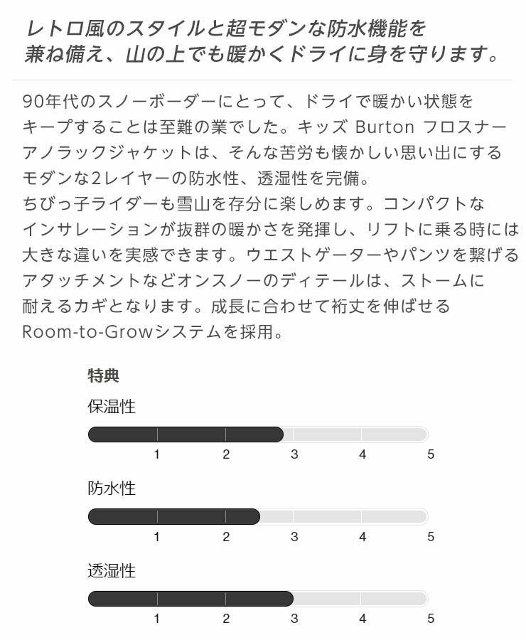 90年代のスノーボーダーにとって、ドライで暖かい状態をキープすることは至難の業でした。キッズ Burton フロスナー 2L アノラックは、フルシーズン活躍するキッズ用ジャケット。真冬の寒い日からシーズン後半の穏やかな天気の日のセッションまで、いつでも快適なライディングを楽しめます。大人用ジャケットと同じ機能をすべて備えているので、子どもたちも大人に負けないライディングを楽しめます。