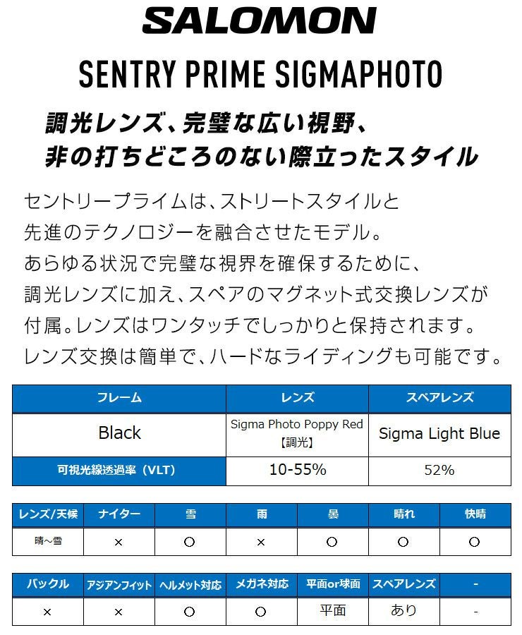 2026 SALOMON サロモン SENTRY PRIME SIGMAPHOTO セントリープライム カラー : Black 調光レンズ : Sigma Photo Poppy Red スキー スノーボード ゴーグル