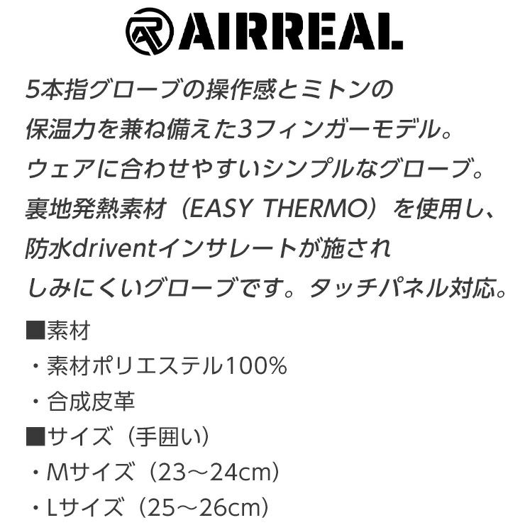 AIRREAL エアリアル スノーボード スリーフィンガー グローブ スキー AR-6583 メンズグローブ 手袋 防寒 スマホ対応