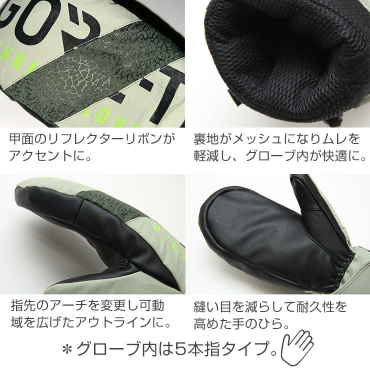 裏地をメッシュにすることで、グローブ内環境をムレのない快適な状態に保ちます。ゲレンデにグラトリにオールラウンドに対応。
