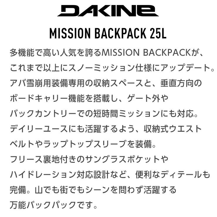 多機能で高い人気を誇るMISSION BACKPACKが、これまで以上にスノーミッション仕様にアップデート。アバ雪崩用装備専用の収納スペースと、垂直方向のボードキャリー機能を搭載し、ゲート外やバックカントリーでの短時間ミッションにも対応します。デイリーユースにも活躍するよう、収納式ウエストベルトやラップトップスリーブを装備。フリース裏地付きのサングラスポケットやハイドレーション対応設計など、便利なディテールも完備。山でも街でもシーンを問わず活躍する万能バックパックです。