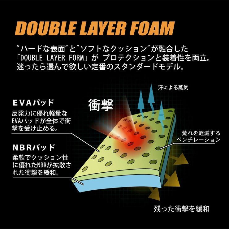 ソフトなクッションが融合した、ダブルレイヤーフォームが、プロテクションと装着性を両立。