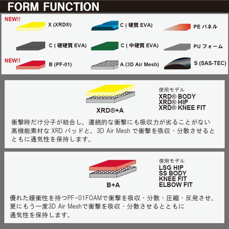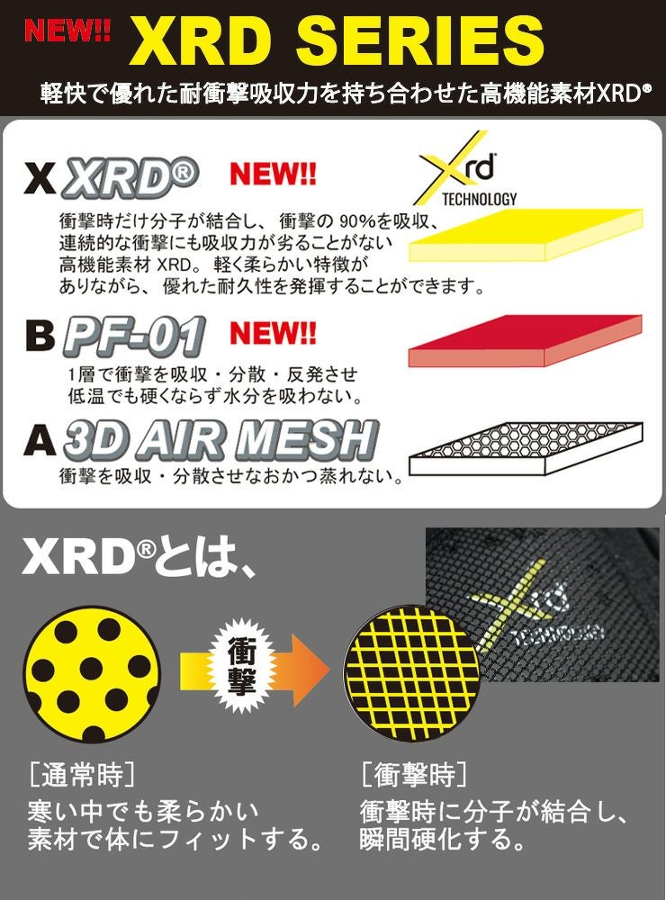 高機能素材XRDは軽く柔らかい特徴がありながら、衝撃時だけ分子が結合し、衝撃の90%を吸収。連続的な衝撃にも吸収力が劣ることがない、優れた耐久性を発揮することができます。
