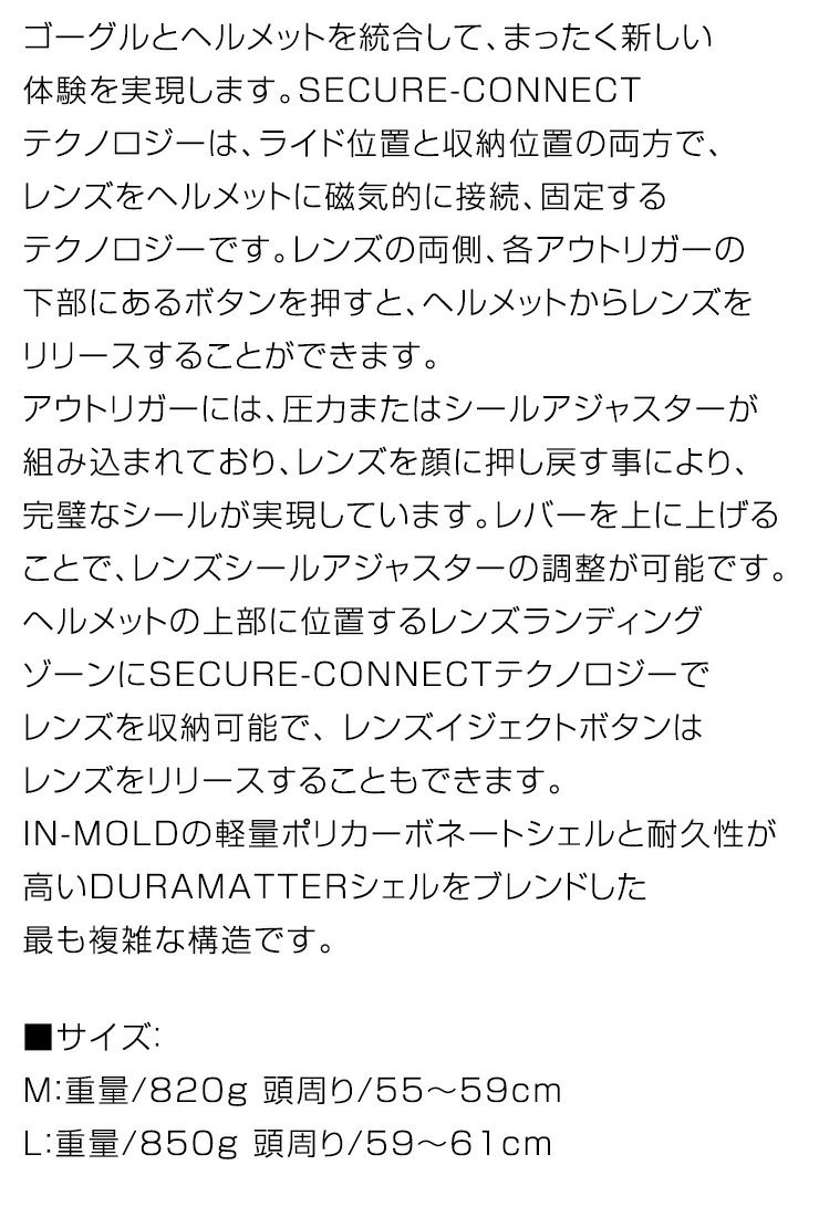 斬新なSecure-Connectテクノロジーによる、しっかりと装着できるデザインで、オプティカル統合の未来を示すだけではなく、バイザーヘルメットのパフォーマンス性における新たな水準を設定します。